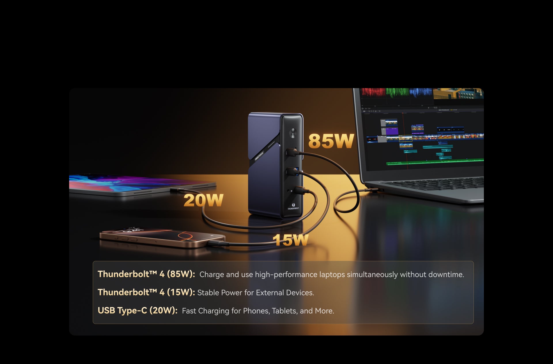 - Thunderbolt 4 ×1 (TBT4 UFP 40 Gbps, PD3.0, 85 W)