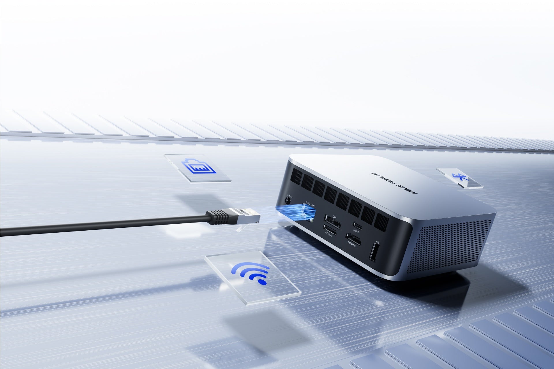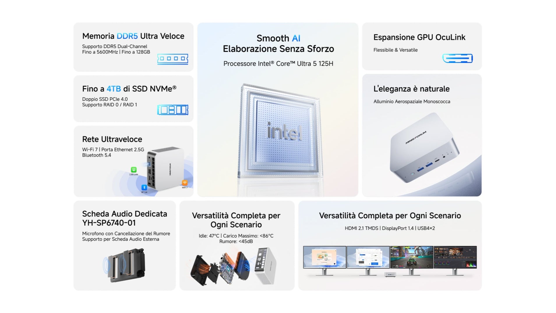 Combina un'estetica elegante in metallo con prestazioni da flagship, supportando DDR5 ad alta velocità, RAID e espansione GPU, ideale per macchine virtuali, Docker e flussi di lavoro IA sulla tua scrivania.