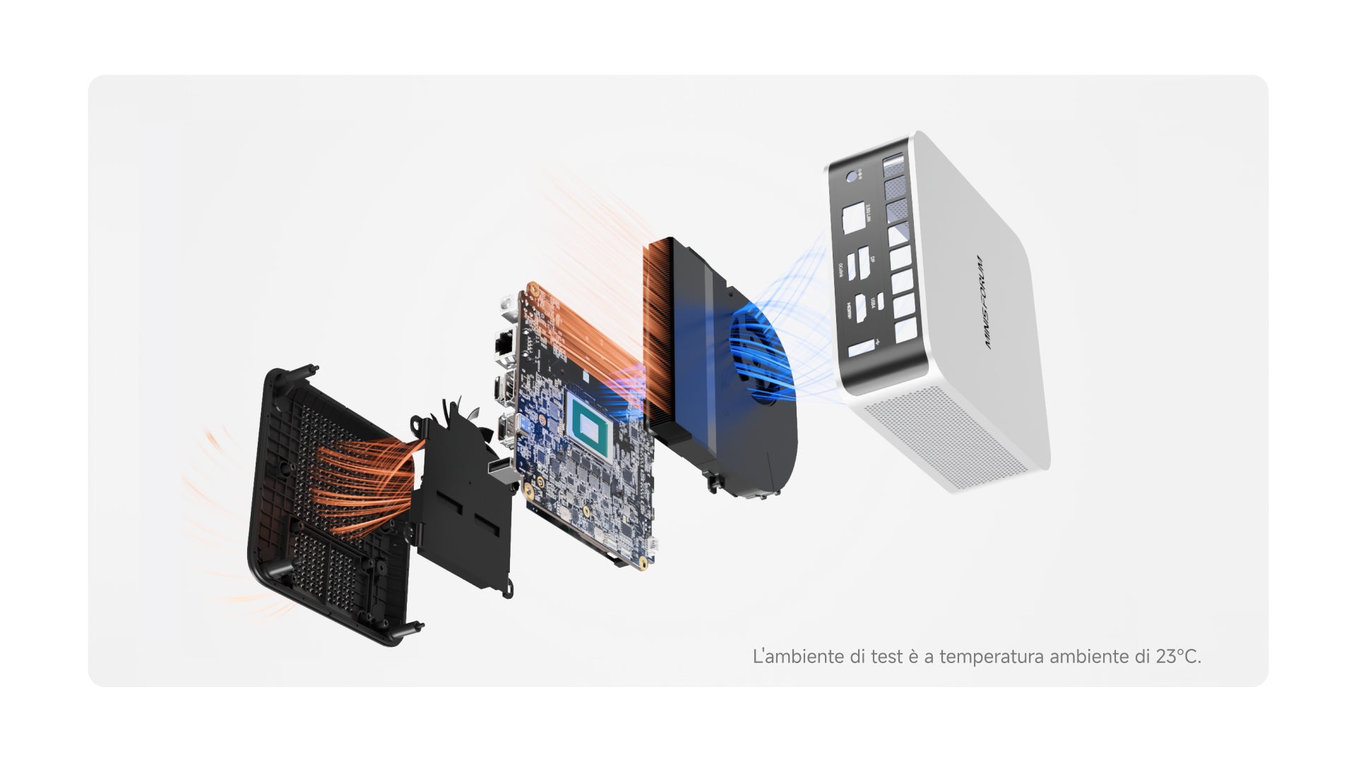 Con materiale a cambiamento di fase ad alta efficienza e doppi tubi di rame, l'M1 Pro dissipa rapidamente il calore (65W TDP). Il sistema a doppia ventola con pale silenziose raffredda efficacemente CPU, memoria e storage. Temperatura idle 47°C, sotto carico <86°C e rumore <45dB: il giusto equilibrio tra silenzio e prestazioni.