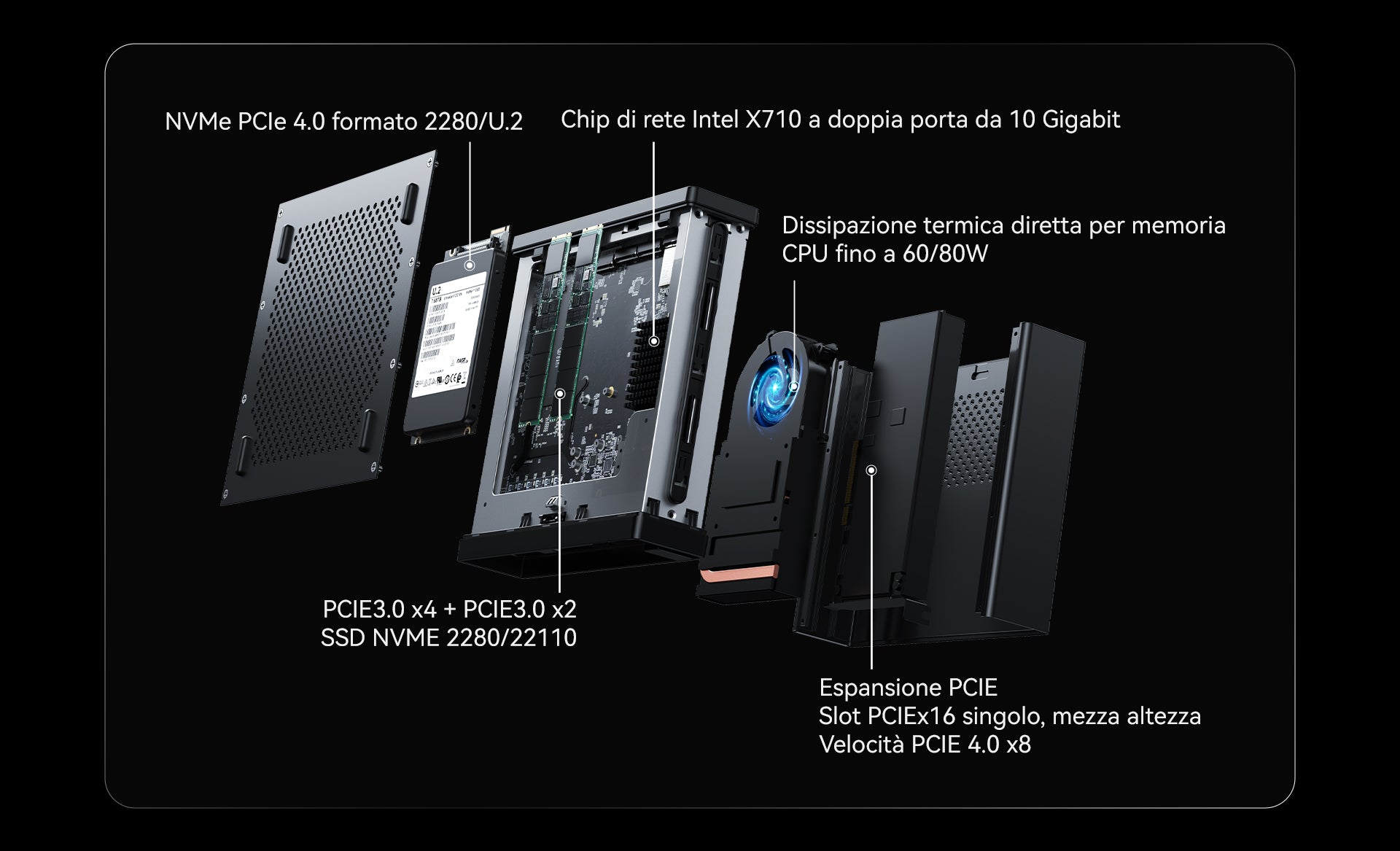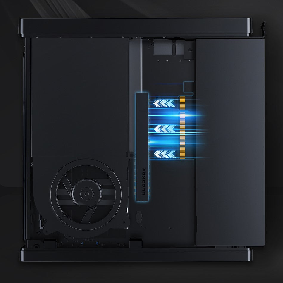 L'MS-01 è dotato di uno slot PCIe 4.0 x16, che consente l'installazione di GPU esterne ad alte prestazioni, schede di rete, controller di archiviazione e altri dispositivi esterni. Grazie alla tecnologia PCIe 4.0 x16, il trasferimento dati è più veloce, garantendo prestazioni ottimali in applicazioni ad alta intensità computazionale e di banda, come gaming, video editing e rendering 3D.
