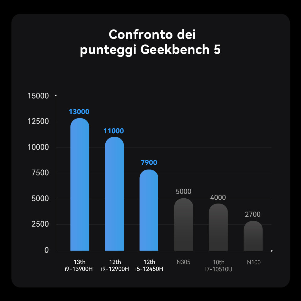 L'MS-01 è equipaggiato con l'high-end Intel® Core™ i9-13900H e Intel® Core™ i9-12900H, processori della serie di 13a generazione. Questo potente processore vanta 14 core (6P+8E) e 20 thread, oltre a una cache L3 da 24 MB. Raggiunge frequenze massime impressionanti, rispettivamente 5,4 GHz e 5,0 GHz.