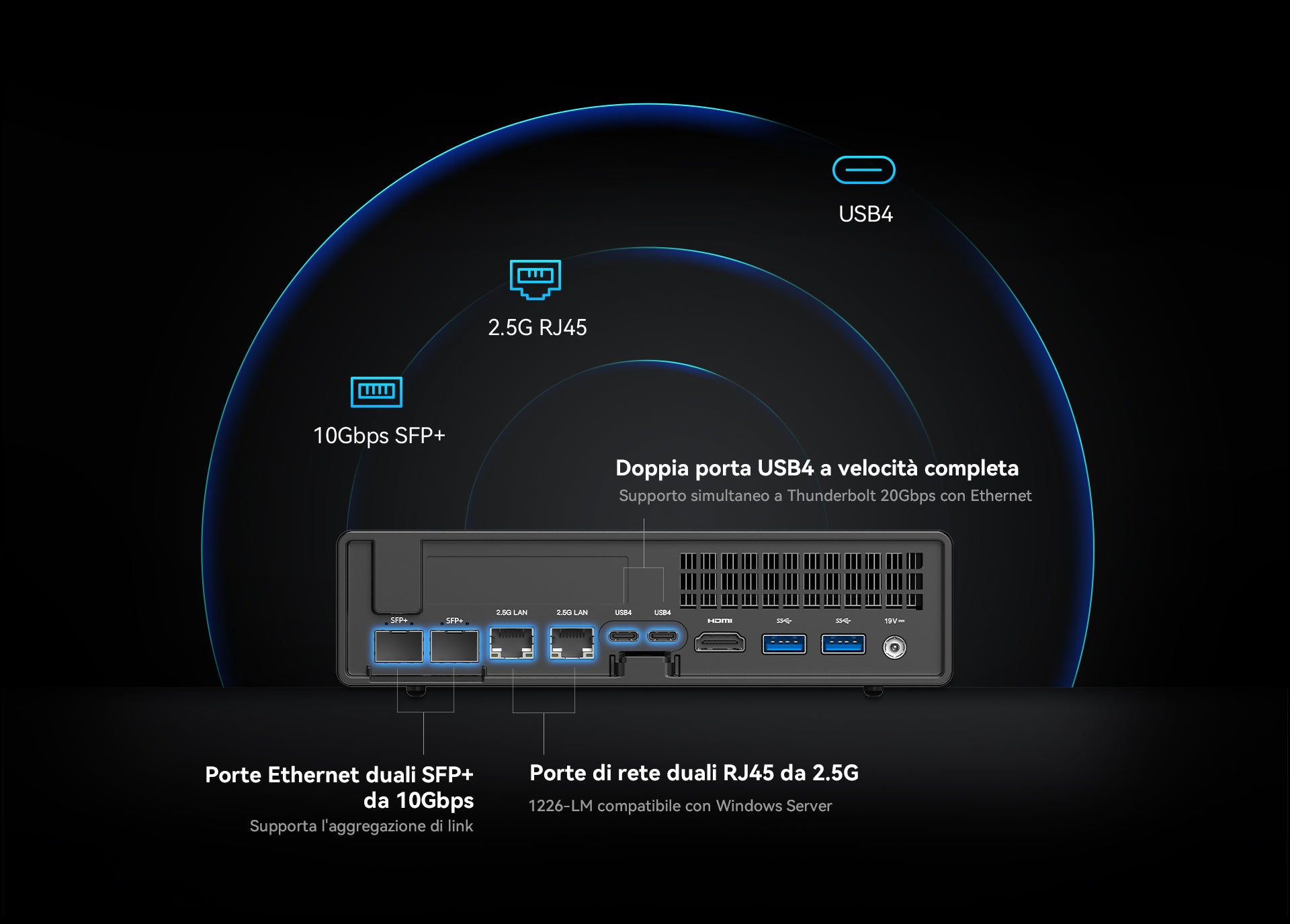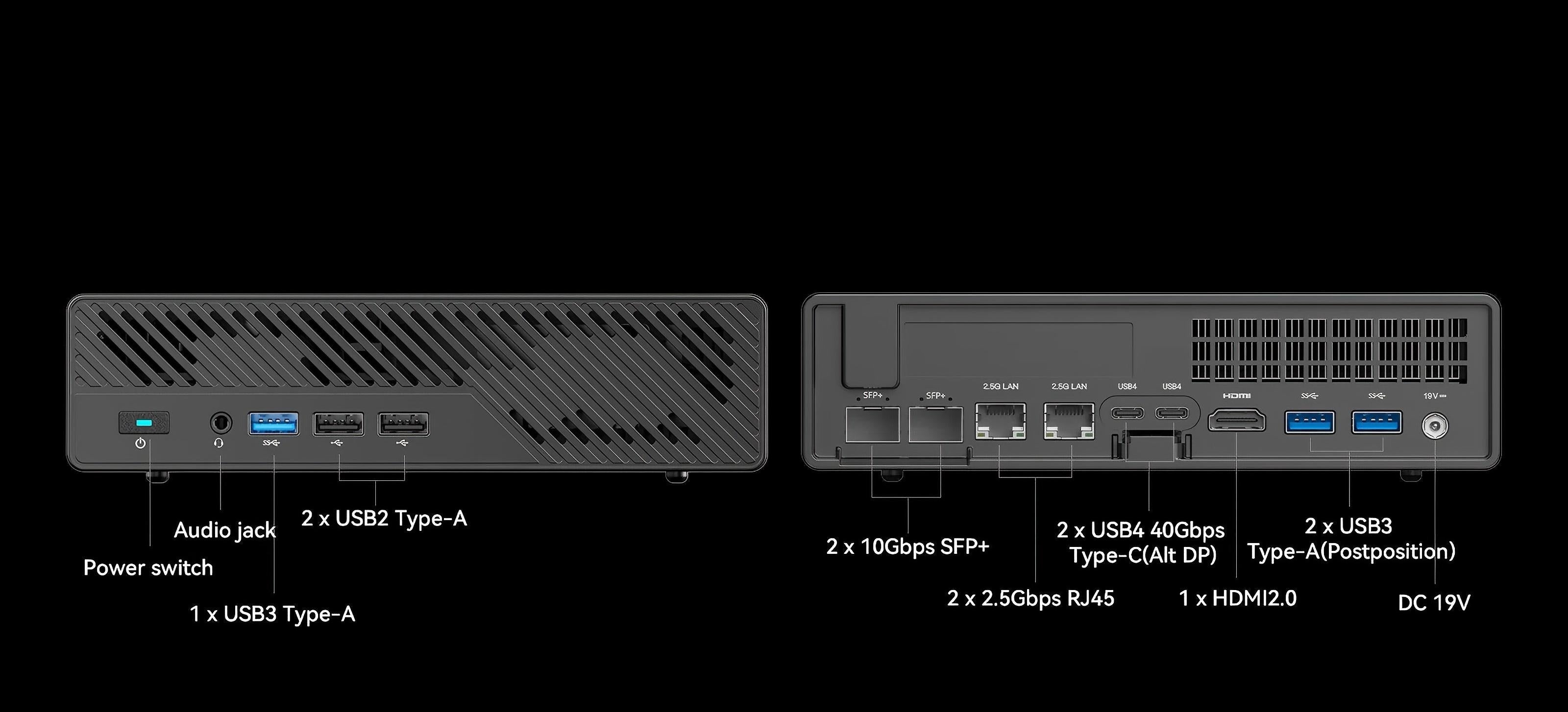 L'MS-01 è dotato di due porte LAN SFP+ integrate da 10 Gbps, due porte LAN RJ45 da 2,5 Gbps e due porte USB 4, offrendo una velocità Ethernet totale fino a 65 Gbps. Questa configurazione garantisce un'esperienza di rete ultraveloce senza precedenti.