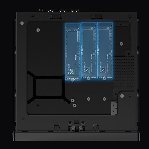 È possibile espandere la memoria con fino a tre SSD M.2 NVMe, dove ogni slot supporta una capacità massima di 2TB. Lo slot più a sinistra è compatibile con PCIe 4.0, con una velocità di trasferimento massima di 7000MB/s. Il sistema supporta sia la configurazione RAID0 per aumentare la capacità, sia RAID1 per una maggiore sicurezza dei dati.