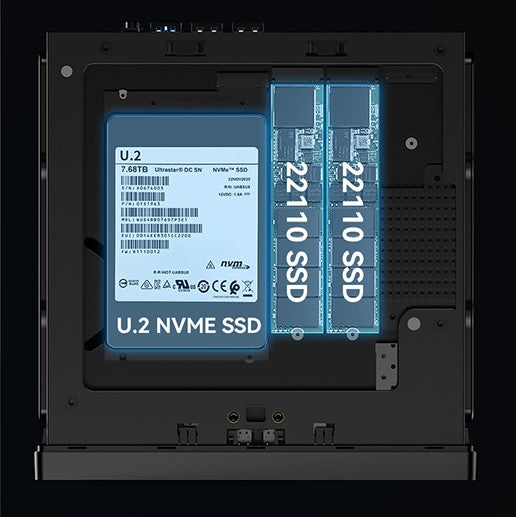 MS-01 supporta anche storage di classe enterprise, permettendo un'espansione fino a un massimo di 24TB con la configurazione composta da un SSD U.2 NVMe e due SSD M.2 NVMe 22110. Questa capacità soddisfa le esigenze dei professionisti che richiedono storage ad alta capacità.